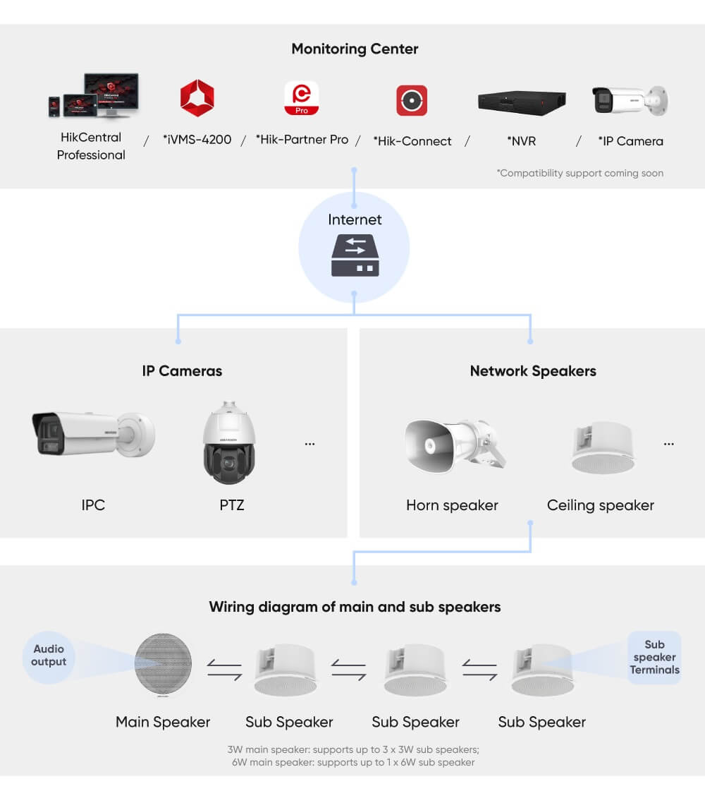 Seamlessly combining Hikvision’s extensive expertise in video security with intelligent audio capabilities, Hikvision audio solutions deliver advanced audio-video linkage for effective real-time intervention. With robust connectivity, they integrate effortlessly into Hikvision’s comprehensive security systems, making them ideal for broadcasting live or pre-recorded voice messages and supporting proactive security strategies.